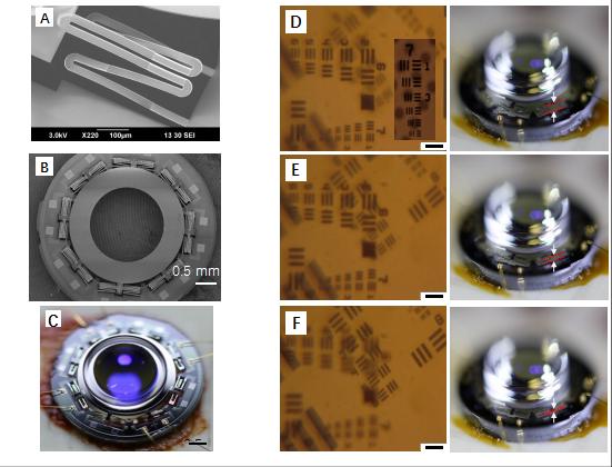 圖2. (A) 電熱MEMS執行器SEM;(B)MEMS微驅動平臺芯片SEM;(C)MEMS微透鏡照片;(D-F)MEMS微透鏡在不同電壓下的USAF分辨率卡疊層顯微圖片。