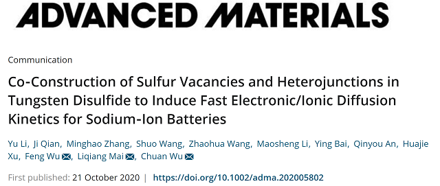 編輯:劉曉雪 審核:金海波 閱讀次數(shù):近日,北京理工大學(xué)材料學(xué)院吳鋒院士團(tuán)隊(duì)在鈉離子電池材料的結(jié)構(gòu)設(shè)計(jì)和性能優(yōu)化方面取得重要突破。材料類國際頂級期刊《Advanced Materials》(《先進(jìn)材料》,影響因子27.398)以“Co-Construction of Sulfur Vacancies and Heterojunctions in Tungsten Disulfide to Induce Fast Electronic/Ionic Diffusion Kinetics for Sodium-Ion Batteries”為題在線報道了這一研究進(jìn)展。該工作由吳鋒院士團(tuán)隊(duì)的吳川教授課題組完成,北京理工大學(xué)材料學(xué)院博士后李雨為第一作者,北京理工大學(xué)吳鋒院士、吳川教授和武漢理工大學(xué)麥立強(qiáng)教授為共同通訊作者(文獻(xiàn)鏈接:https://onlinelibrary.wiley.com/doi/10.1002/adma.202005802)。