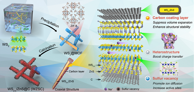 基于上述思想,吳川教授課題組首次報道了一種具有硫空位和異質(zhì)結(jié)構(gòu)的雙金屬硫化物/碳復(fù)合材料,該材料展示出快速的電化學(xué)動力學(xué)特性和出色的可逆容量。該合成手段“一石三鳥”,通過引入金屬有機(jī)框架材料,能夠在WS2納米棒的表面原位生長均勻的ZIF-8層。經(jīng)煅燒處理后,WS2表面上形成了均勻的碳保護(hù)層。此外,由于金屬Zn和W的電負(fù)性差異, Zn與S更易結(jié)合,原位生成WS2/ZnS異質(zhì)結(jié)構(gòu);同時在WS2中形成豐富的硫空位。該復(fù)合材料具備以下優(yōu)點(diǎn):1)均勻的碳包覆層促進(jìn)電子快速遷移并提供良好的電導(dǎo)性,同時抑制循環(huán)過程中材料的體積膨脹,從而保證復(fù)合材料的結(jié)構(gòu)穩(wěn)定性;2)形成的WS2/ZnS異質(zhì)結(jié)構(gòu)能夠產(chǎn)生內(nèi)置電場效應(yīng),促進(jìn)額外的電荷轉(zhuǎn)移,以增強(qiáng)反應(yīng)動力學(xué);3)WS2晶體中產(chǎn)生的硫空位不僅可以提供更多的反應(yīng)活性位點(diǎn),還可以誘導(dǎo)W金屬原子周圍產(chǎn)生過量電子,形成負(fù)電荷中心,加速Na+的快速傳輸。該創(chuàng)新成果突破了二維過渡金屬硫族化合物的鈉離子電池動力學(xué)壁壘,對能源材料的優(yōu)化設(shè)計(jì)以及高比能動力電池的構(gòu)建,提供前瞻性的理論支撐。