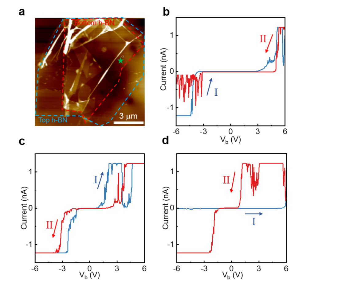 圖5展示了滑移憶阻器的C-AFM圖。圖a展示了PS-BN在石墨烯薄片上的原子力顯微鏡圖(上下兩層h-BN均以虛線標出)。圖b-d展示了PS-BN 在同一點上的I-V 曲線和憶阻行為(圖a中綠色星形標記處)。