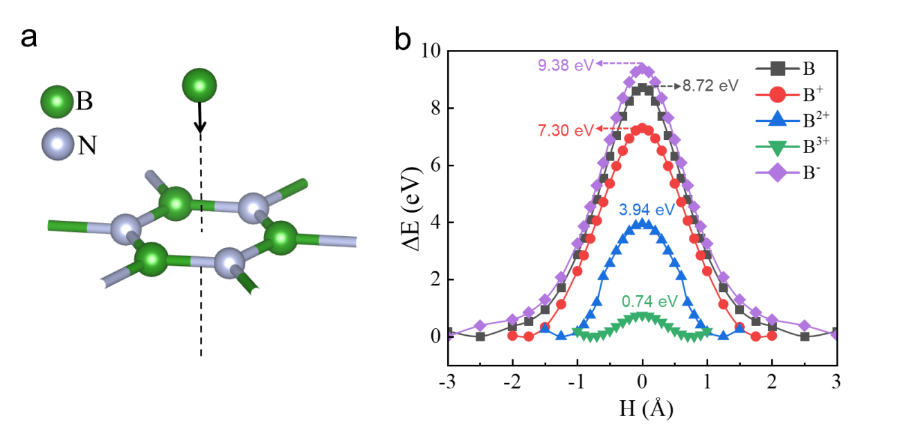圖4展示了原子/離子穿過 h-BN 層所需的遷移能。圖a展示了h-BN 層的原子結構,B 原子/離子位于六邊形中心上方。B 原子/離子沿黑色虛線移動,穿過 h-BN 層。圖b展示了系統能量(ΔE)與 H(B 原子/離子距離 h-BN 層的高度)的函數關系。分別展示了中性 B 原子(黑線)、帶一個正電荷的 B+(紅線)、帶兩個正電荷的 B2+(藍線)、帶三個正電荷的 B3+(綠線)和帶一個負電荷的 B-(紫線)的能量勢壘。