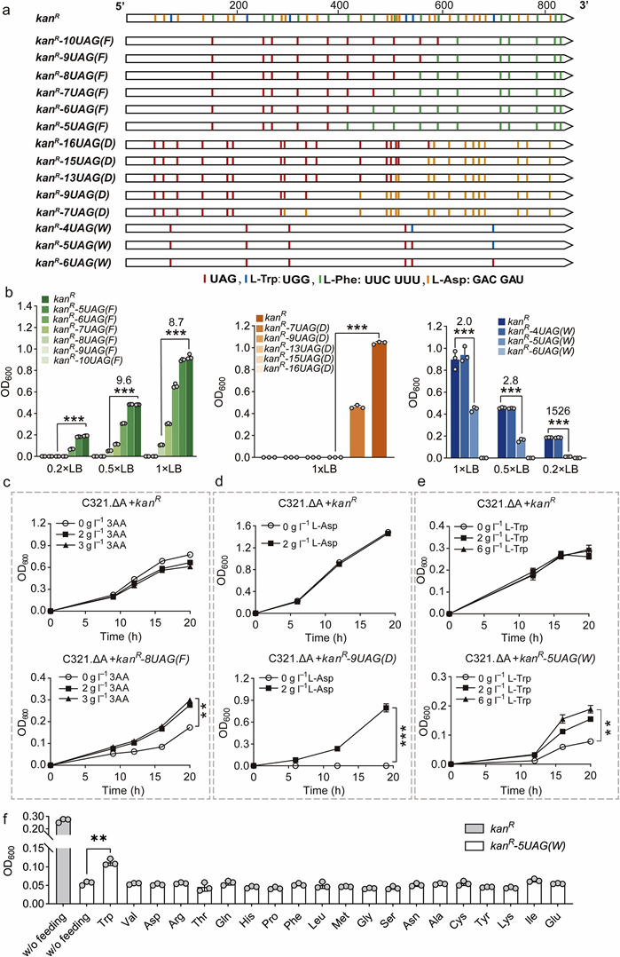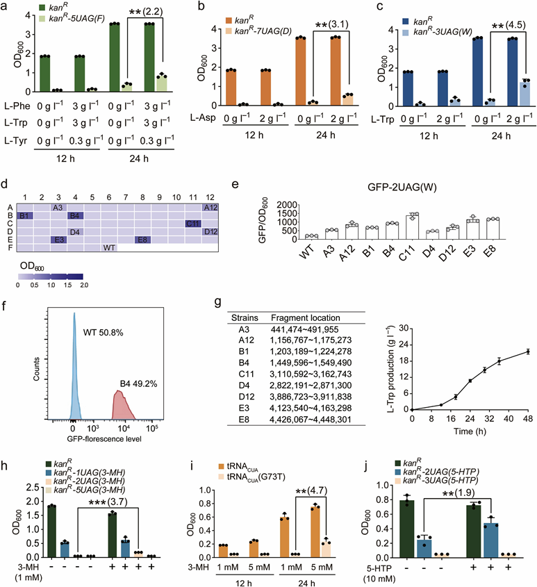 基于上述原理,本團隊提出了一種基于人造tRNACUA的氨基酸高產菌株篩選策略。作為概念驗證,通過基于生長和/或熒光激活細胞分選(FACS)的篩選,分別從大腸桿菌和谷氨酸棒狀桿菌的隨機突變庫中篩選出L-色氨酸、L-苯丙氨酸和L-天冬氨酸等五種氨基酸的高產菌株,并構建了L-半胱氨酸,L-賴氨酸,L-甘氨酸和L-谷氨酸以及兩種非蛋白質氨基酸(5-羥基色氨酸和3-甲基-組氨酸)的選擇系統。為了進一步降低篩選標記的設計難度和提高本策略的通用性,在氯霉素抗性基因 cm 的5′末端添加了一段富含UAG的Tag序列,建立了一種改進的篩選標記。這種標記基因可以適用于對所有氨基酸高產菌株的篩選,并且可以通過簡單的PCR法改變UAG的數量,來調節篩選強度的大小。隨后,還證明了該策略可以被推廣至大腸桿菌MG1655,XL10-gold,C321.?A和谷氨酸棒狀桿菌。