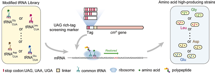 氨酰化是一種兩步多底物反應,其速率不僅取決于兩種主要底物tRNA和氨基酸的濃度,還取決于它們各自與氨酰化合酶(aaRS)的親和力。抑制這些因素中的任何一個都會破壞氨酰化過程,而促進其他因素應該可以補償這種負面影響。基于這一原理,可以根據目標氨基酸,使用與aaRS或aaRS-aa親和力降低的tRNA,篩選目標氨基酸的高產菌株。其中,改造tRNA的反密碼子是一種通用且簡便的降低其與aaRS親和力的方法。而在所有64個密碼子中,琥珀密碼子UAG通常不編碼氨基酸,將tRNA的反密碼子更改為UAG互補三聯體(CUA)提供了一種通用的解決方案,既可以降低tRNA與同源aaRS的親和力,又可以防止干擾其他氨基酸的正常翻譯。