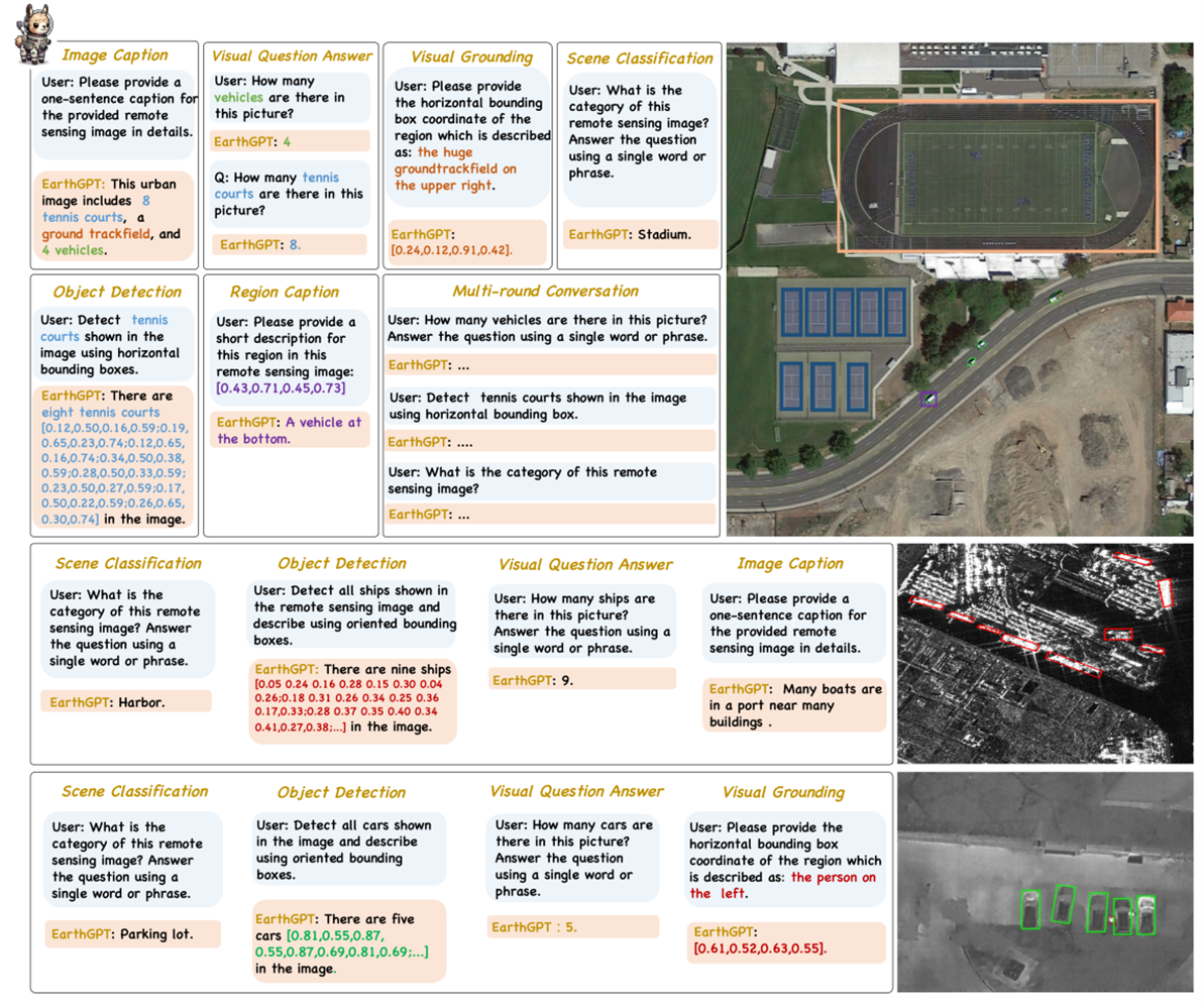 圖1 EarthGPT可通過(guò)自然語(yǔ)言交互的方式,完成多傳感器遙感圖像解譯和多視覺(jué)推理任務(wù)
