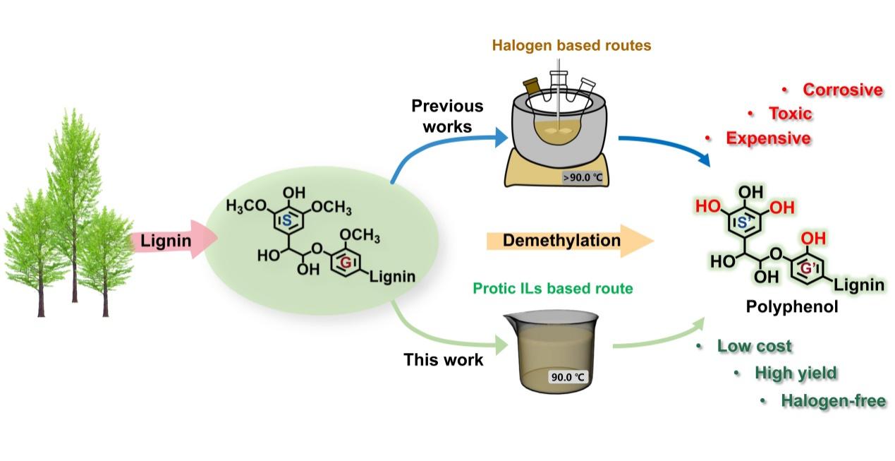 上述工作不僅實現了木質素在無鹵素條件下的高效脫甲基化,而且具有成本低、反應條件相對溫和、回收效果好等優點,對于木質素的高值化利用以及多酚工業的發展具有重要意義。