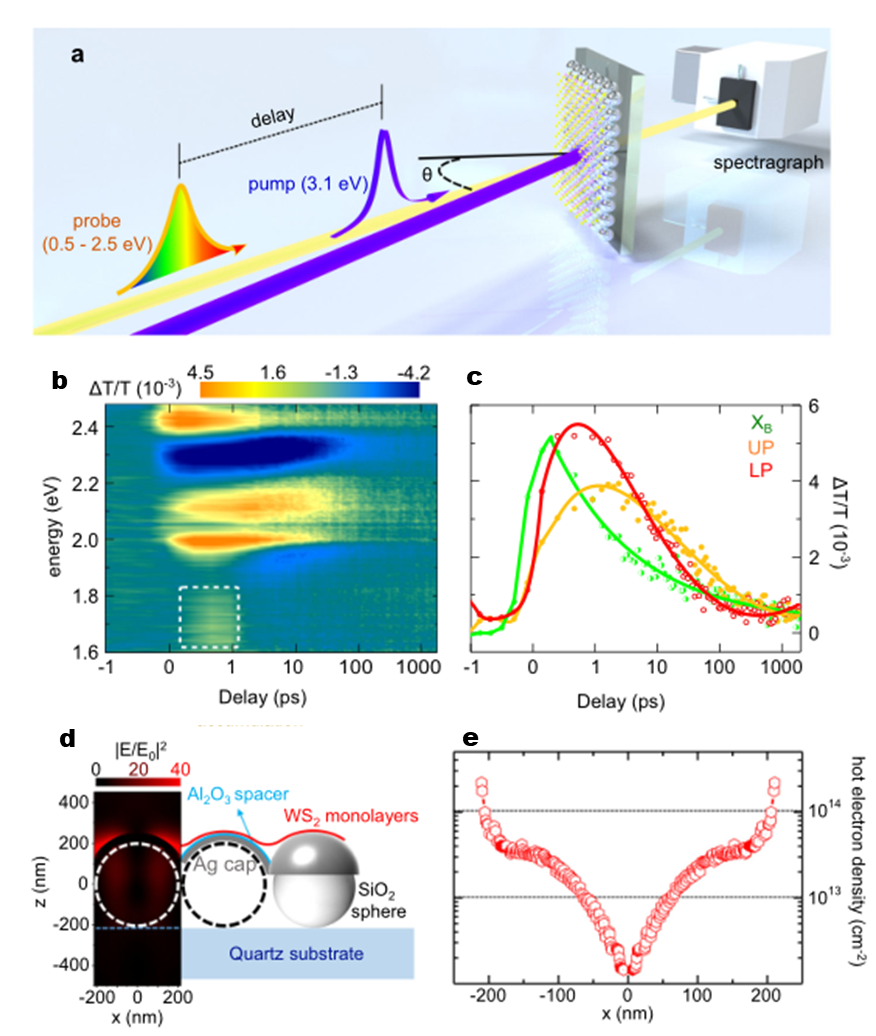 圖1. (a)實驗裝置圖。(b)由表面等離激元和二維半導體組成復合體系的瞬態吸收譜。由于強耦合效應,二硫化鎢原本位于2.1eV處的吸收峰劈裂為兩個吸收飽和峰。帶隙重整化導致了在1.6 eV處出現了新的光學增益峰。(c)體系中激子和極化子的衰減曲線。(c)和(d)結構中的場增強分布和熱電子濃度的空間分布圖。