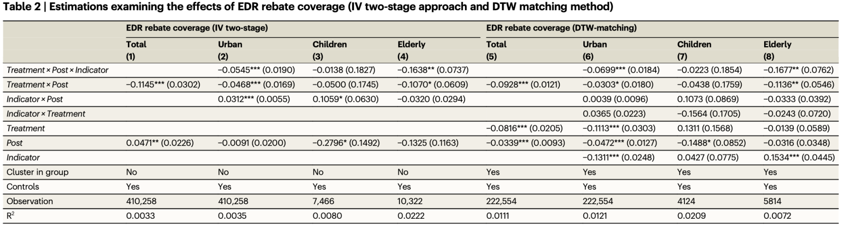 圖1:基于激勵的EDR措施對異質群體高峰時期用電的影響。(a-d. 描述了不同群體中EDR組和無通知組的電力節約量。縱坐標表示基準日和處理日之間的用電量(以千瓦時為單位)的差異。a.整體效果; b.城市和農村家庭;c.有兒童的家庭;d.有老人家庭)