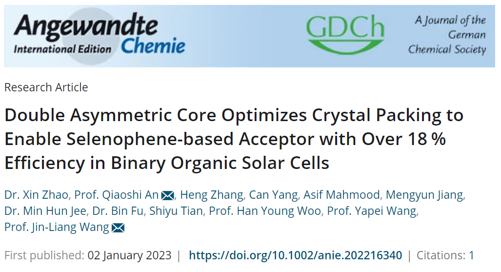 編輯:段凱龍 審核:王振華 閱讀次數:近期,北京理工大學化學與化工學院王金亮教授團隊在集成外側烷基不對稱異構化和單硒取代策略的硒吩類小分子受體材料創制及其在高性能有機太陽能電池的應用研究方面取得重要進展,相關研究成果發表在國際化學領域頂級期刊《Angewandte Chemie International Edition》上,題為“Double Asymmetric Core Optimizes Crystal Packing to Enable Selenophene-based Acceptor with Over 18?% Efficiency in Binary Organic Solar Cells”。 北京理工大學為唯一通訊單位,化學與化工學院王金亮教授和安橋石特別研究員為共同通訊作者,碩士研究生趙鑫和安橋石特別研究員為該論文的共同第一作者。