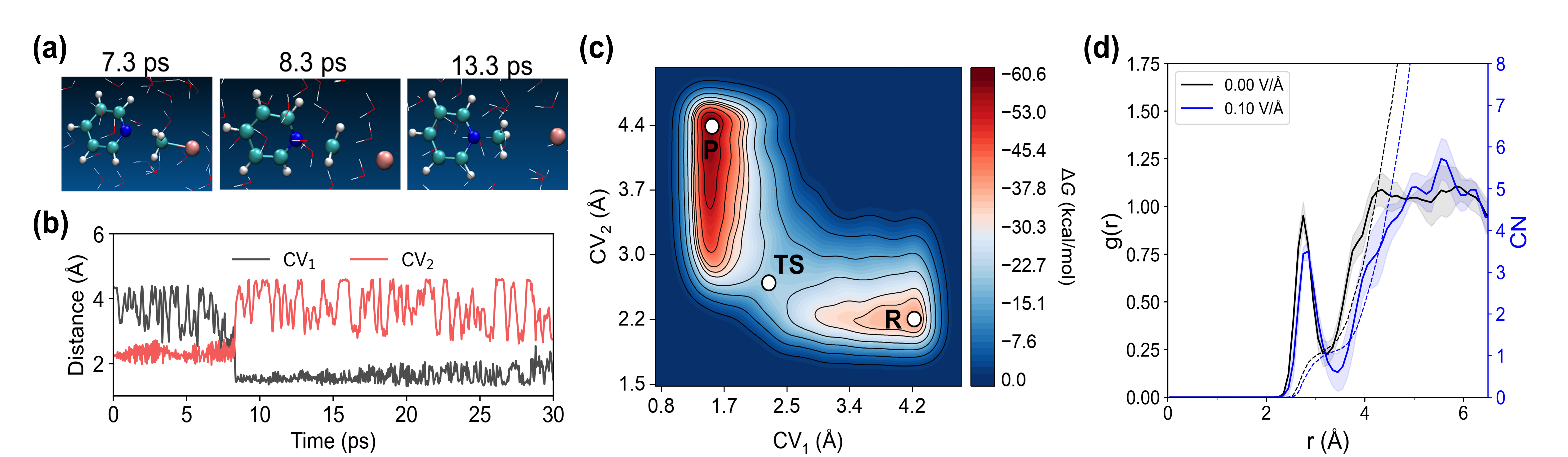 圖2. 從頭算分子動力學模擬門舒特金反應。(a) 軌跡代表性快照。 (b) 集合變量隨時間變化曲線。 (c) 門舒特金反應自由勢能面。 (d) 親核位點周圍水分子在有/無電場下的徑向分布。