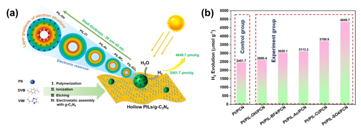 為了實(shí)現(xiàn)改性策略的突破,課題組基于離子液體微環(huán)境及其過程強(qiáng)化機(jī)制方面的長(zhǎng)期積累,提出了以聚合離子液體作為“電子儲(chǔ)體”的概念,發(fā)展了具有層級(jí)電子分布的中空聚合離子液體微球 (PIL- x ), 并將其用于修飾的g-C3N4。利用其陰陽(yáng)離子可以調(diào)控殼結(jié)構(gòu)中不同電子層厚度,影響體系的電子傳輸儲(chǔ)備行為,獲得了性能優(yōu)異的產(chǎn)氫催化劑(圖3)( Chem. Eng. J., 2022, 135625 )。該工作拓寬了聚合離子液體的應(yīng)用范圍,為g-C3N4及其他光催化劑的改性提供了一條新的思路,對(duì)于開發(fā)高效的光催化劑具有重要的意義。