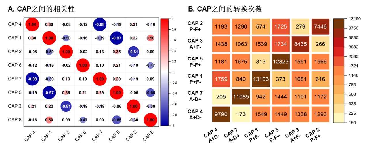 圖2 不同激活模式(CAP)間的相關性和相互轉換