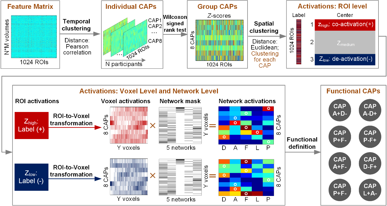 大腦功能磁共振成像技術是衡量腦功能變化的重要工具之一,可以用于多維度腦機制研究。先前研究已經使用動態腦功能連接技術發現了與衰老相關的大腦不同狀態,但不能描述腦區間共同變化模式。閆天翼教授團隊開發了腦區間共激活模式分析算法,以單幀數據為最小分析單元,能夠以更高時間分辨率解析大腦的動態變化。因此,本研究通過量化大腦激活水平獲得不同模式的明確定義(如圖1),促進對復雜衰老過程背后的動態腦網絡變化的解釋。