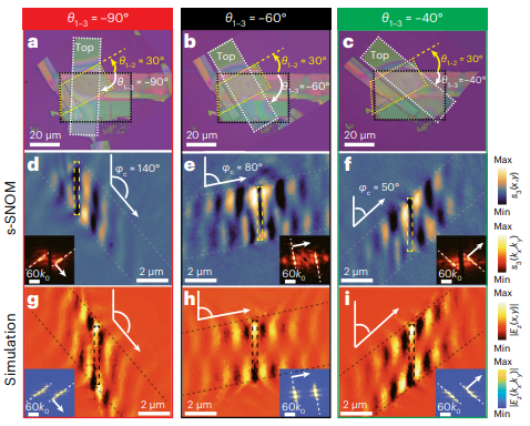 為了在實驗上直接觀測三層氧化鉬晶體中轉角對納米紅外光場無衍射傳播的調制作用,研究人員采用了散射型掃描近場光學顯微鏡(s-SNOM)來表征三層轉角氧化鉬晶體的近場光學分布。從圖3中可以看到:在三層轉角氧化鉬晶體中存在多個光學魔角,不同光學魔角下納米紅外光場沿不同方向低損耗、無衍射傳播,與之前的理論研究一致。也就是說,通過改變轉角可以在三層氧化鉬晶體中實現納米光場無衍射傳播方向的面內全角度調控。