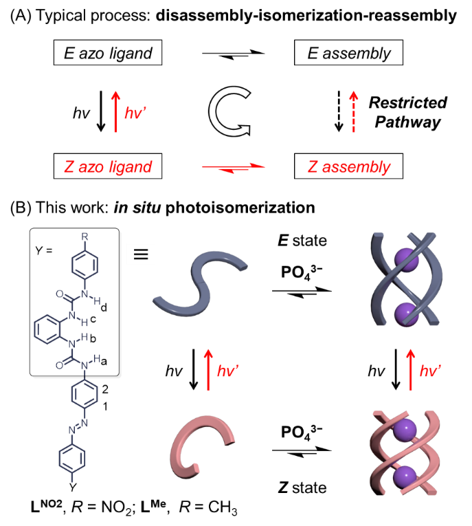 吳彪教授研究團隊一直致力于陰離子配位作用相關的基礎理論和前沿應用交叉研究,發展了“陰離子配位誘導組裝”的新策略,實現了一系列超分子組裝結構的精準調控 ( Acc. Chem. Res. 2022, 55, 3218-3229)。研究發現,得益于陰離子配位作用的預組織多重氫鍵網絡結構,形成的組裝體具有強的結構靈活性和自適應性,能夠發生類似于“彈簧”變化的分子運動 ( Angew. Chem. Int. Ed. 2021, 60, 9389-9394)。近期,利用偶氮苯骨架的多脲配體與磷酸根離子的配位作用,偶氮苯的順-反異構化行為能夠控制組裝結構(四面體籠和三股螺旋體)的可逆變化。在此基礎上,為了厘清組裝結構對偶氮苯光異構化行為的影響,他們系統研究了三股螺旋體的光異構過程。實驗結果表明:偶氮苯光異構化過程中,三股螺旋體發生了“原位”光異構化現象(如圖1B所示);這與普遍認知的“解離-光異構化-重組”過程明顯不同。