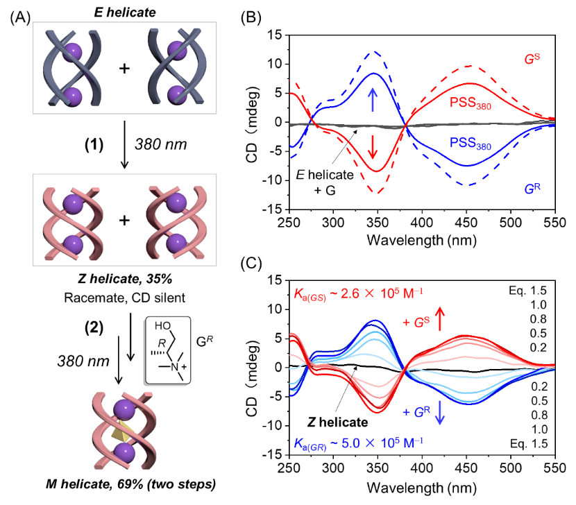 利用外部刺激調節超分子手性(如開/關、強度變化和手性反轉)不僅有助于理解生命體中的手性行為,而且能夠為設計傳感、催化和數據處理的新型手性光學材料提供參考方法。鑒于順式三股螺旋體優異的客體結合能力,以α-甲基膽堿衍生物作為手性客體,通過光照和手性客體引發誘導了同手性三股螺旋體的形成。圓二色光譜(CD)證實了光激發-手性結合的串聯作用對手性三股螺旋體的調控,如圖3所示。