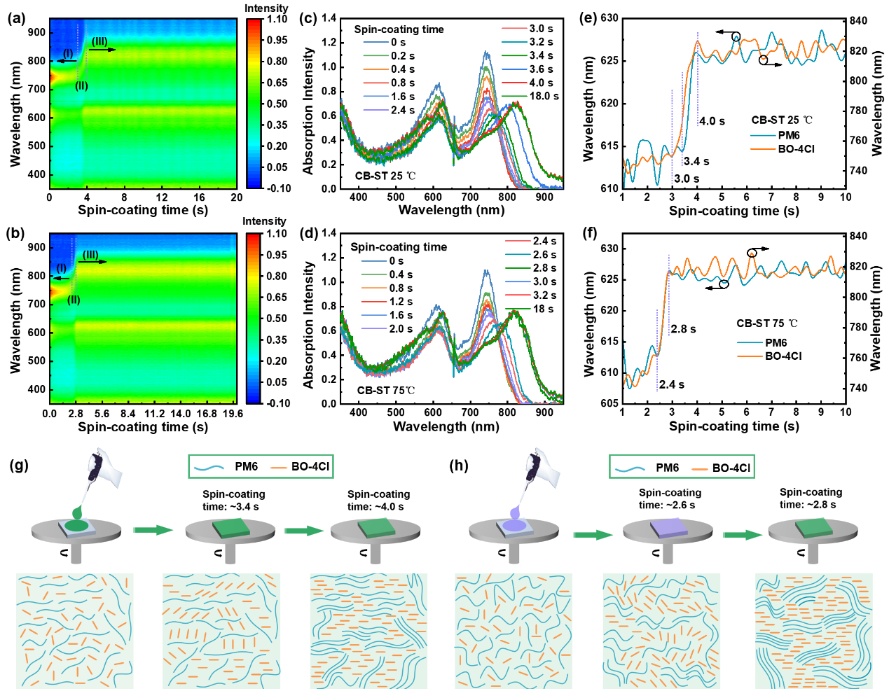 圖1. (a) PM6, BO-4Cl分子式。(b) PM6, BO-4Cl, 界面層和電極的能級示意圖。(c) 不同工藝有源層制備示意圖。(d) PM6, (e) BO-4Cl和(f) PM6:BO-4Cl溶液的變溫吸收光譜。