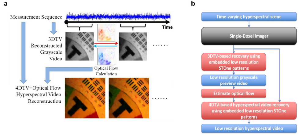 高光譜視頻成像捕獲場景的精細空間、光譜和時間信息,在生物熒光成像、遙感、監控、自動駕駛等領域中具有廣泛應用。高光譜視頻數據量極大,現有方法記錄高維數據時占用大量傳輸帶寬和存儲空間,給無人機、手機、行星探測器和衛星等資源受限系統帶來巨大壓力。如何在保留信息的前提下最大限度減少采樣數據量、大幅提升采樣壓縮比是高光譜視頻成像中的關鍵問題。該研究利用四維高光譜視頻的高度可壓縮性,設計一種空間-光譜聯合編碼方案,提出基于四維空間信號稀疏度模型的優化重建和深度學習重建方法,實現了基于單像素探測器、可在低帶寬下實現高通量的高光譜視頻成像系統。如圖1,優化重建方法先從包含互補圖案的原始測量中重建灰度視頻并提取光流,然后通過光流輔助四維全變分正則化優化方法實現高光譜視頻重建。
