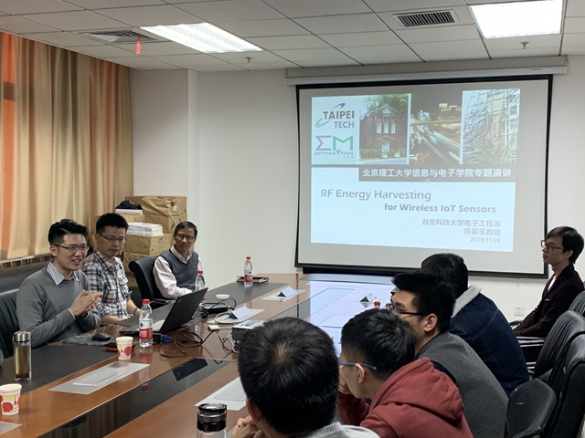 編輯:曹安琪 審核:司黎明 閱讀次數(shù):11月8日下午,北京理工大學(xué)信息與電子學(xué)院聯(lián)合研究生院邀請臺北科技大學(xué)電子工程系陳晏笙(Yen-Sheng Chen)教授、曾柏軒(Po-Hsuan Tseng)教授來校進(jìn)行學(xué)術(shù)交流。陳晏笙教授應(yīng)邀做了題為“RF Energy Harvesting for Wireless IoT Sensors”的“21世紀(jì)學(xué)科前沿”系列學(xué)術(shù)報告。出席此次會議的有信息與電子學(xué)院王華教授等十余名教師、博士研究生和碩士研究生。