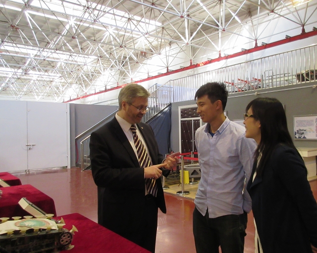 會談后,代表團一行訪問了我校方程式賽車工作室。機械與車輛學院董路寧老師向代表團詳細介紹了賽車的性能及比賽成績。多伊沃涅恩司長對我校學生在工程創新方面取得的成績表示贊揚,并表示將推動俄羅斯有關高校與我校在此領域的聯系。