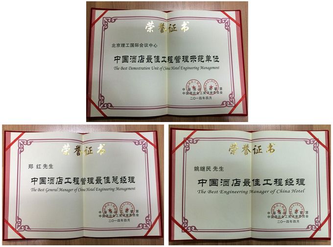 2013年和2014年,理工國際會議中心連續兩次獲得中國酒店工程聯盟、中國酒店“金工獎”評審委員會評選的“中國酒店最佳工程管理示范單位”和“中國酒店最佳工程管理示范單位”榮譽稱號。姚繼民同志連續兩年被評為“中國酒店最佳工程經理”,鄭紅同志連續兩年被評為“中國酒店工程管理最佳總經理”。