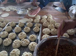 志愿者和孩子們一起包包子 志愿者們幫助義賣