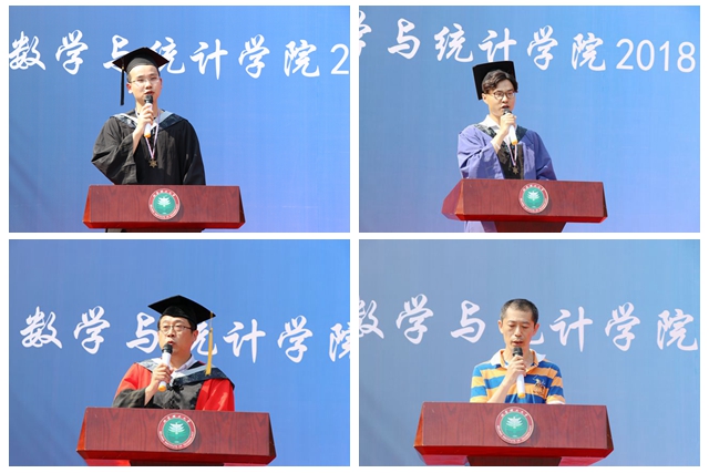張世強,吳昊分別代表畢業本科生、研究生發言。他們代表全體畢業生感謝學校、學院的培養,感謝教師、父母的關心,感謝同學、朋友的鼓勵。他們還表達了將用知識和行動報效祖國的決心,也表達了對學校、學院、師生的美好祝愿。蔣立寧代表全體教師發言。他祝福同學們擁有清澈的心,永遠上進,不以大學的結束作為求知的終點,他祝福同學們擁有平和的心,寧靜致遠。本科生劉新桐的父親劉杰先生作為家長代表發言,他感謝學院四年來對孩子們的教育與照顧,并向全體畢業生寄予了未來人生道路上“做好人,做好事”的期盼。