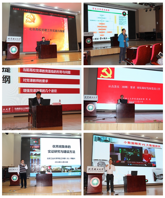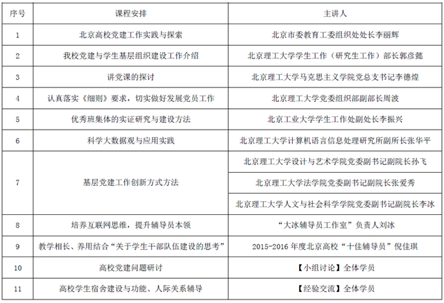 培訓基地邀請了北京市委教育工委組織處處長李麗輝、北京理工大學學生工作(研究生工作)部部長郭彥懿、馬克思主義學院黨總支書記李德煌、黨委組織部副部長周波、北京工業大學學生工作處副處長李振興、北京理工大學計算機語言信息處理研究所副所長張華平、設計與藝術學院黨委副書記副院長孫飛、法學院黨委副書記副院長張愛秀、人文與社會科學學院黨委副書記副院長李冰、“大冰輔導員工作室”負責人劉冰、2015-2016年度北京高校“十佳輔導員”倪佳琪等進行主講。