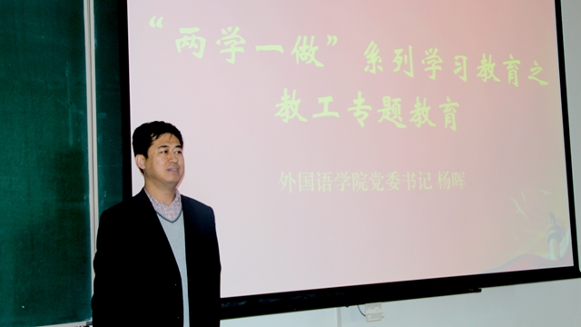 編輯:卞廣為 審核:楊暉 閱讀次數(shù):按照學(xué)校相關(guān)工作部署,2016年11月22日下午,外國語學(xué)院“兩學(xué)一做”系列學(xué)習(xí)教育之教工專題教育在研究生樓302教室進(jìn)行。本次專題教育由學(xué)院黨委書記楊暉主講,面向全體教職員工,是對“兩學(xué)一做”的延伸和拓展。學(xué)院領(lǐng)導(dǎo)和全體教工參加。