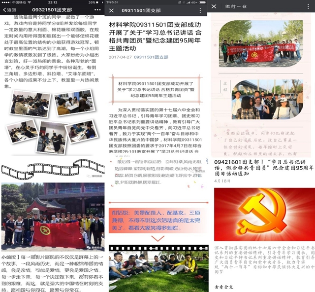 其中09421601團支部組織觀看《入團第一課》,共同演唱《光榮啊!共青團》讓整個團支部緊緊聯系在一起,共同表達共青團員,大學生的青春活力和創造力。09111501團支部則深入學習總書記講話,學習共青團的建團歷史以及討論如何做合格的共青團員,讓團員更加深了對團的了解,明確了自己作為一名合格共青團員團員的義務與責任,在將來的學習與工作中,堅定中華民族復興的偉大信念,為民族事業貢獻自己的力量。09411401團支部舉辦了研討沙龍+故事分享,“做合格共青團員”交流會等活動,讓團員們將遠大理想和正確成長路徑結合在一起,將自身發展與中華民族偉大復興的中國夢結合在一起,努力學習,不斷為實現偉大的中國夢而努力。09221301團支部全體團員前往海淀公園觀看了海淀公園百姓周末大舞臺的表演,在嘹亮的軍歌中接受愛國主義教育,同學們在游覽中實現了對身體的鍛煉,增進了感情,并在交流中提高了對黨中央和團中央一些政策的理解。