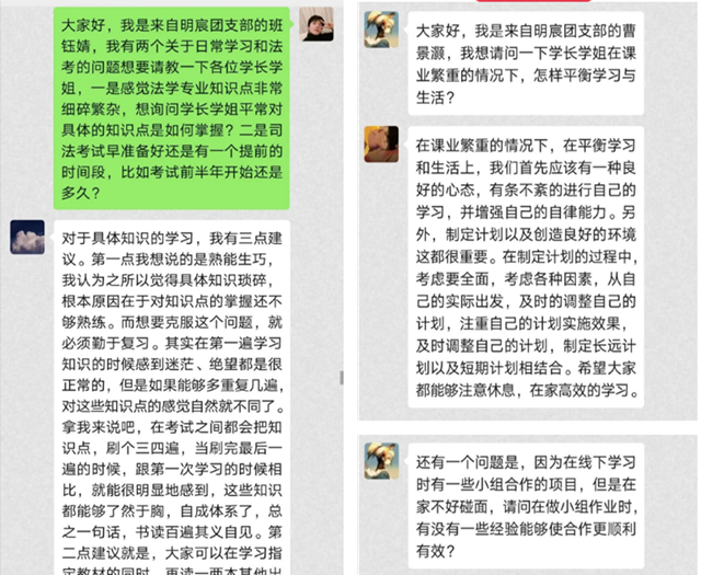 “長時間在家中線上學習學習效率很低,想問問學長學姐們怎樣在家中長期保持高效學習呢?”明德書院明宸團支書趙語遲就最近居家學習遇到的問題向學長學姐們提出問題。