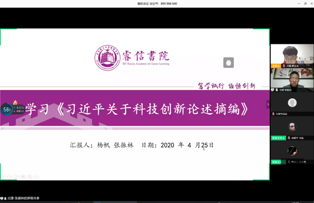 睿信書院學生黨員郭云龍、06911801團支部趙居甲帶領大家學習了習近平總書記給北京大學援鄂醫療隊全體“90 后”黨員的回信及“90 后”黨員的先進事跡。 學生黨員楊帆、張振林領學了《習近平關于科技創新論述摘編》,對與青年科技創新有關的內容進行了重點解讀。