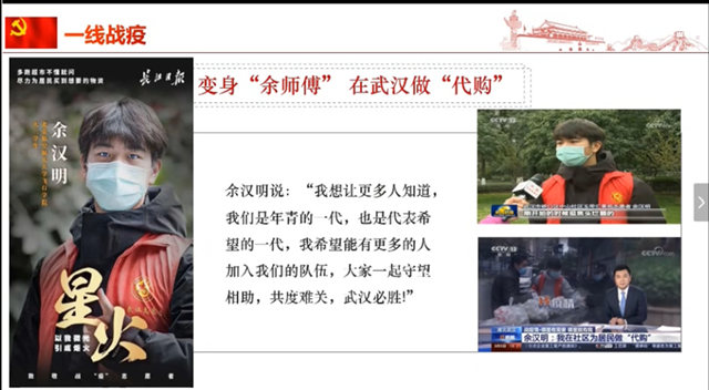 北航優秀志愿者余漢明講述了自己在武漢做“代購”的親身經歷,帶領大家了解了基層疫情防控志愿者的辛勤工作,展現了青年大學生不畏艱辛、無私奉獻的優秀品質。