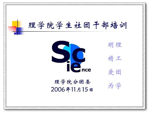 2006年11月15日(星期三)晚19:00,一年一度的理學院學生社團干部培訓如期舉行。一季季分團委的窗外青綠變成了澄黃,一代代理學院學生干部舊貌換新顏。當碩果累累的2005學年悄然走遠,輝煌映在昨日,2006學年是嶄新的白紙,充滿了想象但依然任重道遠。精誠團結、善行善思,理學院分團委周波、李明智、安泰、盧俊峰四位老師以他們個性的方式,以真切的體驗依次向理學院新一屆的學生社團干部講授了一堂內容充實、形式活潑的培訓課程,使大家受益匪淺。