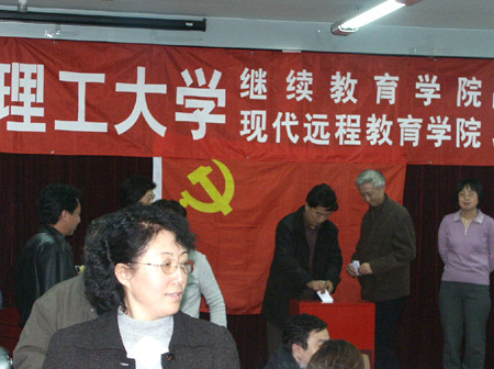 11月27日下午4點,北京理工大學繼續教育學院暨現代遠程教育學院黨員代表大會在逸夫樓410會議室隆重舉行,鮮紅的黨旗莊嚴地掛在會議室內,黨旗上方是一副“北京理工大學繼續教育學院暨現代遠程教育學院黨員大會”的大橫幅,把會議室裝點得分外喜氣而莊嚴。會議由繼續教育副書記副院長劉世奇主持。參加大會的來賓有北京理工大學副書記、副校長楊賓,組織部副部長李躍華,繼續教育學院書記汪本聰、梅文博院長,副院長弭曉英、劉世奇、李小平及支部共20名黨員和1名學生黨員參加了會議。隨著中華人民共和國國歌的奏起宣布大會開始,組織委員宋勝臺受黨支部的委托做近三年工作總結,接著劉世奇副書記宣讀校黨字2006(32)號關于成立繼續教育學院黨總支的批復。大會嚴格按照程序進行了選舉,選出了首屆黨總支成員:汪本聰、梅文博,劉世奇、楊莉和劉曉紅。校組織部副部長李躍華對大會的召開表示熱烈的祝賀,提出按“四個同步”抓緊做好黨建工作,增強班子的團結和和諧,發揮黨組織的模范帶頭作用和戰斗堡壘作用。