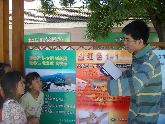 村民們一邊看著展板上的東西,一邊議論著,學(xué)生黨員們在邊上給村民們介紹起了關(guān)于黨員紅色“1+1”活動、順義奧林匹克水上公園和北京理工大學(xué)體育館以及關(guān)于奧運(yùn)的一些常識。