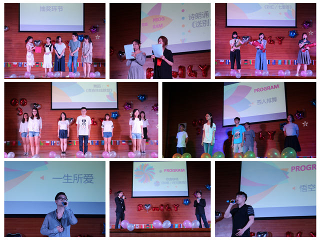 歡樂的第一輪抽獎環節結束后,大四畢業生更是不甘寂寞,紛紛亮出自己的拿手好戲。英語二班集體上演《青春陣線聯盟》,從搖擺萌舞到廣播體操,引發陣陣歡笑;日語班帶來經典《幻想萬華鏡紅霧異變之章》無違和配音,盡顯高手風范;英語二班唱起周杰倫經典老歌,《彩虹》《七里香》喚起少時溫情回憶;德語班配樂詩朗誦《送別》,中德交織,訴盡人生哲理。