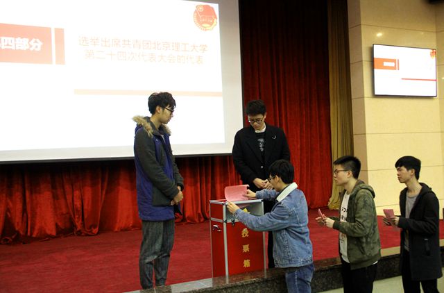 在激蕩的校歌聲中,大會開始選舉。到場的團員代表莊嚴投下選票,選舉共青團北京理工大學機械與車輛學院委員會出席共青團北京理工大學第二十四次代表大會的代表,經過認真嚴謹的計票工作,馬宏邦等35名團員代表當選。
