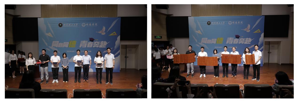 明德書院德昭班學育導師組長鄭佳然、德正班學育導師組長薛少華、人文與社會科學學院學生工作辦公室主任、團委書記顏笑、外國語學院學生辦公室主任、團委書記馬鏈、明德書院原朋輩導師、2018級學生代表李彥沨、馮靖涵等為明德書院優秀畢業書生頒發榮譽證書。