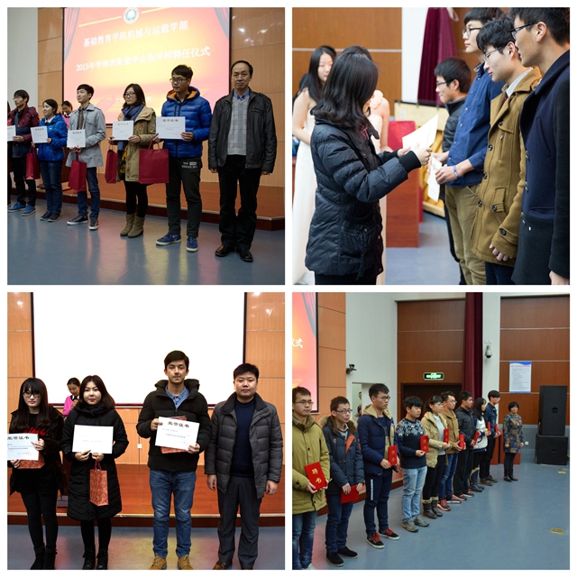 學(xué)部表彰結(jié)束后,學(xué)部學(xué)業(yè)指導(dǎo)負(fù)責(zé)人馬凱宣讀了學(xué)業(yè)指導(dǎo)師聘任決定。經(jīng)過座談、調(diào)查,廣泛征求各方面的意見和建議,學(xué)部面向2015級(jí)組織實(shí)施“國(guó)獎(jiǎng)助力計(jì)劃”和“骨干基礎(chǔ)課輔導(dǎo)”活動(dòng)。經(jīng)過慎重的選拔、雙選,國(guó)獎(jiǎng)助力計(jì)劃聘請(qǐng)16名獲得2015年國(guó)家獎(jiǎng)學(xué)金、迪文獎(jiǎng)學(xué)金的2014級(jí)學(xué)生,骨干基礎(chǔ)課串講師聘請(qǐng)17名在大一學(xué)年骨干基礎(chǔ)課滿分或者專業(yè)排名前三名的學(xué)生。聘任儀式上,學(xué)院領(lǐng)導(dǎo)為這兩類學(xué)業(yè)指導(dǎo)師頒發(fā)了聘書。