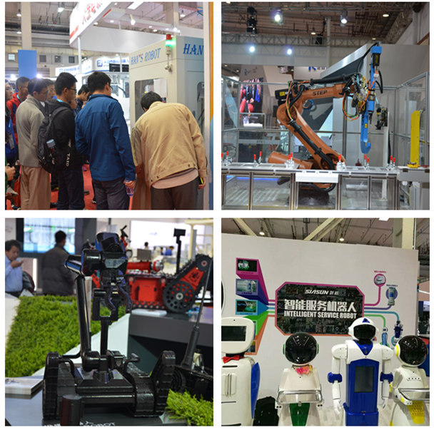 大型機器人模特在海藍色的“世界機器人博覽會”字幕下擺著呆萌的姿勢迎接前來參觀的人群。而各式各樣各種功能的機器人羅列在展覽廳中——不管是服務性機器人、仿人機器人還是機械手。我們圍著展覽廳走了一圈,仔細觀察著每一個智能機器人。
