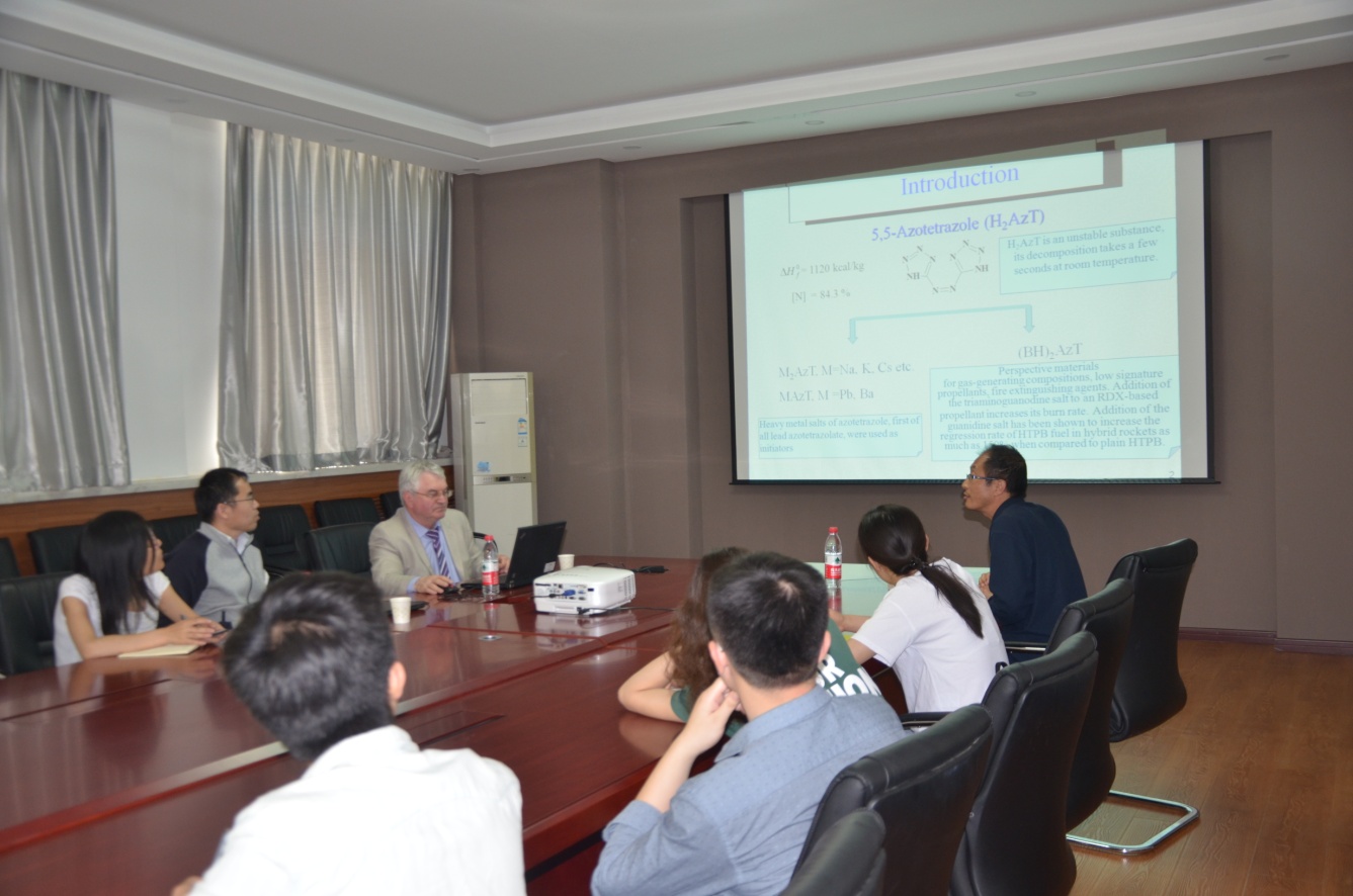 訪問期間,實驗室先后組織了5場精彩的學術報告,Marc A Meyers教授在報告中闡述了高能短脈沖激光輻照在固體材料表面,可以在極短時間內(納秒)產生幾十到上百GPa壓強的沖擊波并沿著傳播方向迅速衰減,利用這種技術可以產生其他實驗手段所達不到的極高應變率。V.P.Sinditskii教授就含能化合物的熱化學、熱分解和燃燒爆炸行為問題,提出了熱分析技術和測壓技術相結合的分析測試手段,對比并解釋了造成這些化合物性能差異的原因。Ahmed MEBARKI教授在報告中以火災爆炸、海嘯等災害為例,講述了災害發生后的傳播以及多米諾效應。這些報告集中反映了材料在極端載荷下的動態力學行為、高能鈍感炸藥的設計理論等方面的國際前沿研究課題,報告受到了師生的熱烈歡迎,引發了現場師生的極大興趣,并與專家學者展開了熱烈的討論。