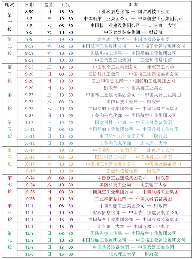 首屆“軍工杯”足球邀請賽將持續至11月8日,比賽地點為北理工西足球場。期間,為慶祝北京理工大學75周年華誕,作為“軍工杯”足球賽的特別環節,9月19日將舉行“校慶杯”明星邀請賽,由來自“軍工杯”9支參賽隊伍的球員組成“明星隊”對陣北理工足球隊,為廣大師生校友球迷朋友獻上精彩賽況,敬請關注。共話軍工情,同筑強國夢,讓我們共同預祝首屆“軍工杯”足球邀請賽取得圓滿成功!