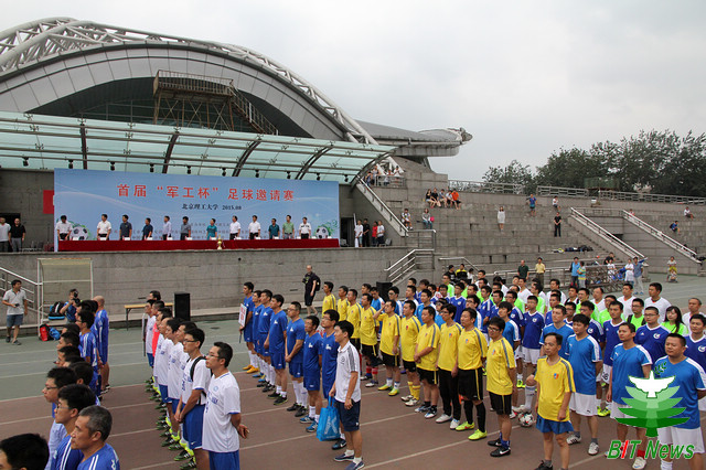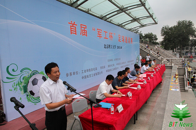 8月30日下午15點30分,由北京理工大學組織舉辦的首屆“軍工杯”足球邀請賽開幕式暨揭幕戰在中關村校區東操場拉開帷幕。出席開幕式的校內領導有北理工黨委書記張煒,常務副校長楊賓,副書記、副校長項昌樂。出席開幕式的參賽單位領導有工業和信息化部直屬機關黨委常務副書記樓宇光,國家國防科技工業局黨組成員王承文、直屬機關黨委常務副書記李坤平,中國兵器工業集團公司直屬工會主席劉德瑞,中國兵器裝備集團公司發展計劃部巡視員、副主任厲大成、黨群工作部副主任、集團公司工會主席蘇福厚,中國航空工業集團公司工會辦公室主任趙奇勝,中國核工業建設集團公司直屬工會主席常甲辰,中國船舶工業集團公司團委書記、黨群工作部副主任丁文強。開幕式由北理工學校辦公室主任汪本聰主持。