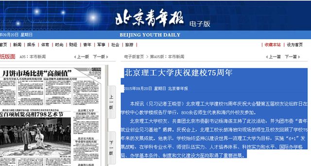 北京理工大學校友、共青團北京市委副書記楊海濱主持了此次活動,并為團市委“青年就業創業見習基地”揭牌。慶祝會上,北理工校長胡海巖向現場的師生及校友回顧了學校75年來的發展成就。他表示,學校始終堅持以建設世界一流理工大學為目標,實施“6+1”發展戰略,在學科專業水平、師資隊伍實力、人才培養體系、科技實力和水平、國際辦學格局、辦學基本條件、制度和文化建設方面均取得了重要進展。