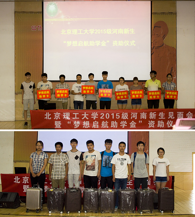 “夢想啟航助學金”資助儀式則是本次活動的重點。該助學金是由北京理工大學教師與校友共同發起捐資設立的,主要用于資助北京理工大學家庭經濟困難的本科新生,可減免或報銷從家鄉到學校報到的車費。這個誕生不久的助學金進一步完善了北理工困難學生的資助體系,從學生接到錄取通知書到畢業,學校對經濟困難學生資助將從不間斷。在資助儀式上,有10位來自河南不同地區的北理工新生獲得了“夢想啟航助學金”的資助。