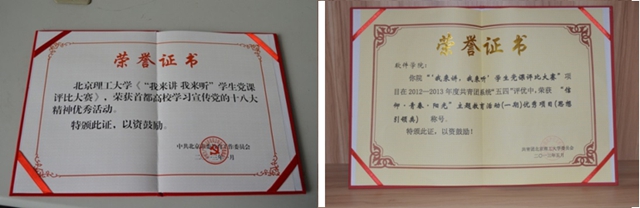 北京市“首都高校學習宣傳黨的十八大精神優秀活動”、“北京高校創先爭優先進基層黨組織”,連續兩年在北京理工大學“信仰?青春?陽光”主題教育活動評比中被評為校級優秀項目,在國內核心期刊《學校黨建與思想教育》上發表論文《基于黨課評比大賽的大學生思想政治教育創新研究》……這些驕人的稱號和成果正是軟件學院學生黨建工作所取得的突出成績。