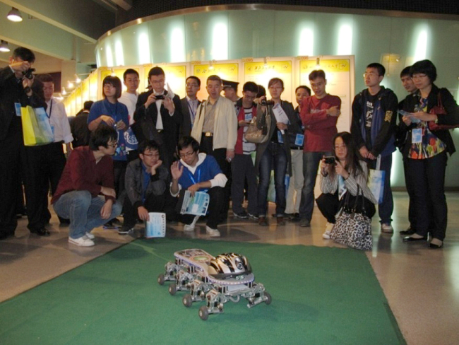 2011年10月22日上午十時,本次全國大學(xué)生創(chuàng)新年會參賽作品競賽正式開始,賽場氣氛即緊張又熱烈,各校選送的參賽作品科技含量高、專業(yè)覆蓋廣,充分反映了各參賽高校大學(xué)生課外創(chuàng)新活動的最高水平和最強(qiáng)實(shí)力。我校兩項(xiàng)參展作品憑借先進(jìn)的理念、創(chuàng)新的構(gòu)思、優(yōu)異的表現(xiàn),在眾多參展作品中脫穎而出,成為閃爍的明星。尤其是“新型節(jié)肢機(jī)器人”,其豐富的行進(jìn)步態(tài)、精彩的運(yùn)動效果、可靠的控制性能、超群的演示功能,使之成為競賽現(xiàn)場的“強(qiáng)中強(qiáng)”和“王中王”。教育部部長助理林蕙青、科技部政策法規(guī)司副司長王宇等領(lǐng)導(dǎo)一到比賽現(xiàn)場,首先就來到我校展位觀看新型節(jié)肢機(jī)器人的運(yùn)動展示。在饒有興致地聽取了項(xiàng)目組組長吳帆同學(xué)的細(xì)致講解并仔細(xì)觀看了機(jī)器人的全套表演后,林蕙青部長助理緊握帶隊(duì)老師兼指導(dǎo)教師羅慶生教授的手,高度評價說:“節(jié)肢機(jī)器人的表演實(shí)在太精彩了!老師辛苦了!同學(xué)們辛苦了!”