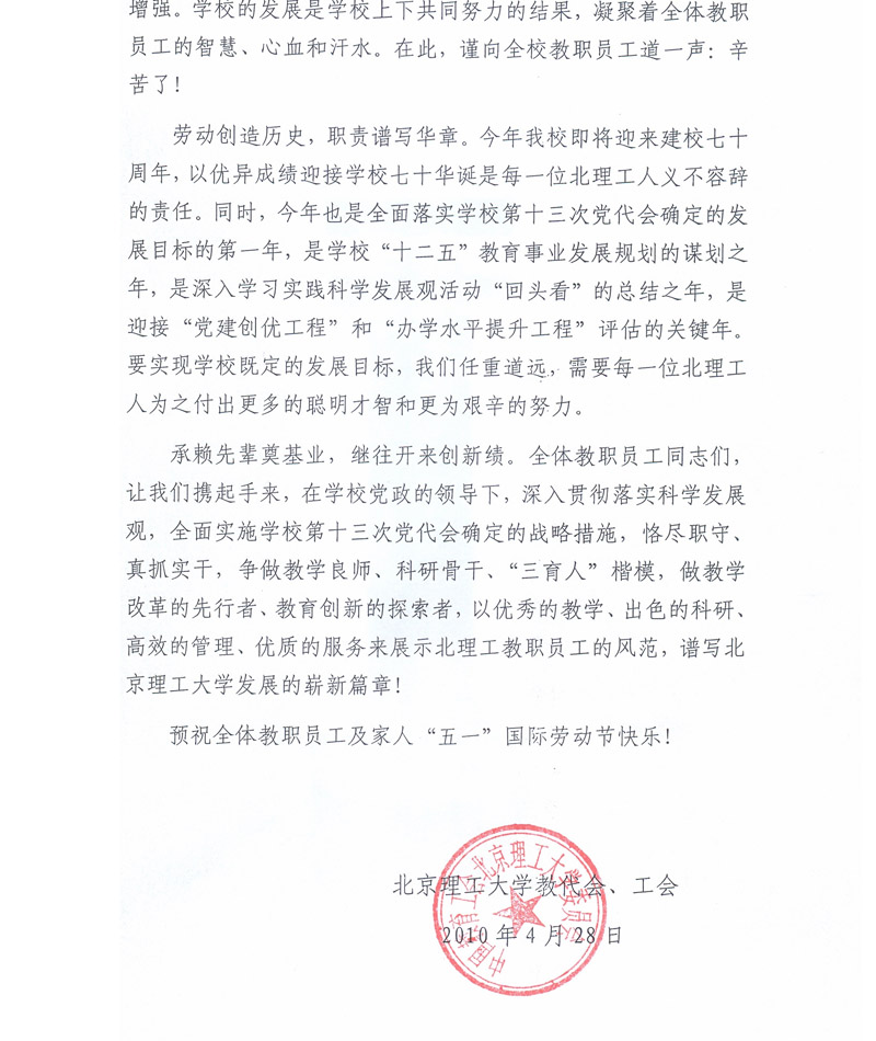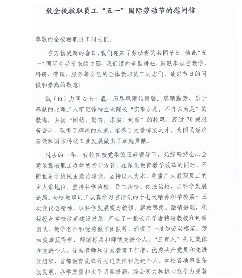 致全校教職員工“五一”國(guó)際勞動(dòng)節(jié)的慰問(wèn)信