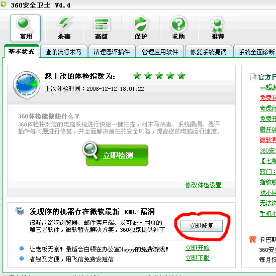 修復步驟2:如發現界面有漏洞提示,請點擊【立即修復】(見下圖)。