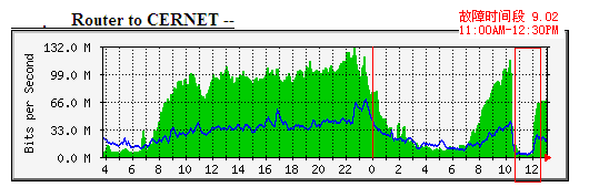后經與我校上聯節點——北京大學溝通,最終確定故障原因為整個教育網斷網,除我校外的其它高校節點均發生了類似的故障現象。